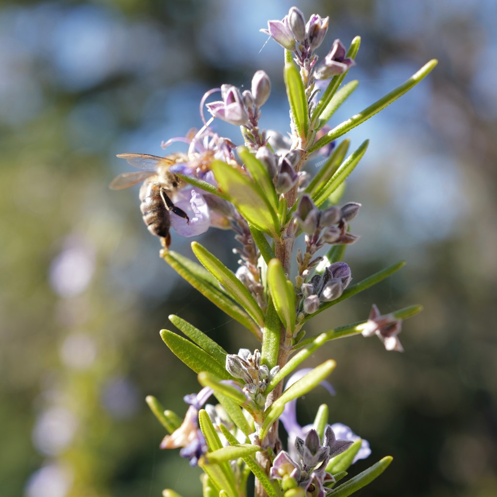As I was dropping by to offer him a ride to our folks, I got to take a photo of the bees hard at work on the flowering rosemary he used for the marinade.