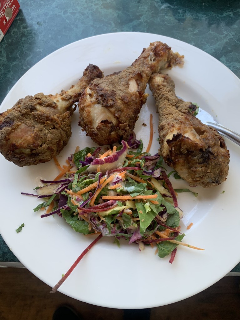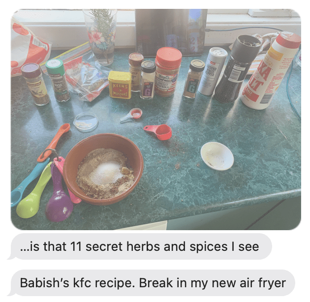 He’s made this many times, and from our conversations, it seems like this recipe, more than others he’s shared, requires practice. Right amount of breading for the chicken and your air fryer.